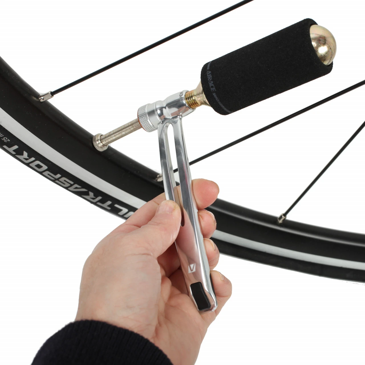 Funtioniert bei Auto-Ventilen (Schrader) und Rennradventilen (Presta), ohne das man etwas umschrauben muss.