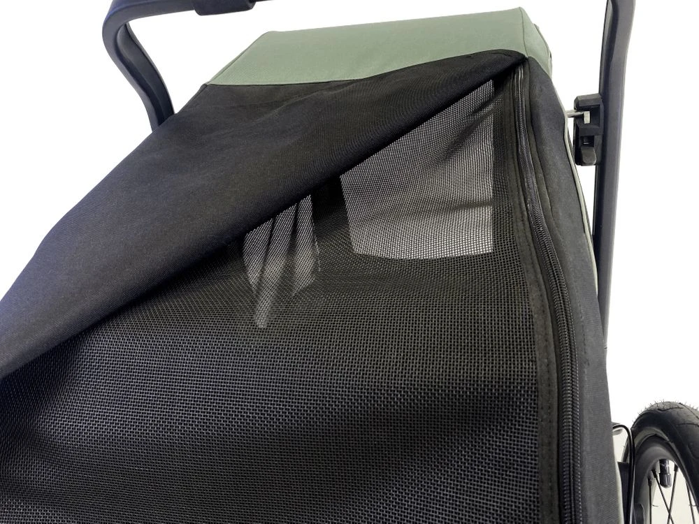 Dank der seitlichen Fenster sowie Front- und Hecköffnungen aus Mesh-Gewebe kann der Hund wĂ€hrend der Fahrt die Umgebung sehen als auch riechen und hat dabei eine optimale BelĂŒftung. Der obere teil des AnhĂ€ngers besteht aus festem Stoff, das hintere Mesh-Fenster kann optional mit einem zusĂ€tzlichen Cover geschlossen werden, um an heiĂen Tagen Schatten zu spenden oder vor Regen zu schĂŒtzen.