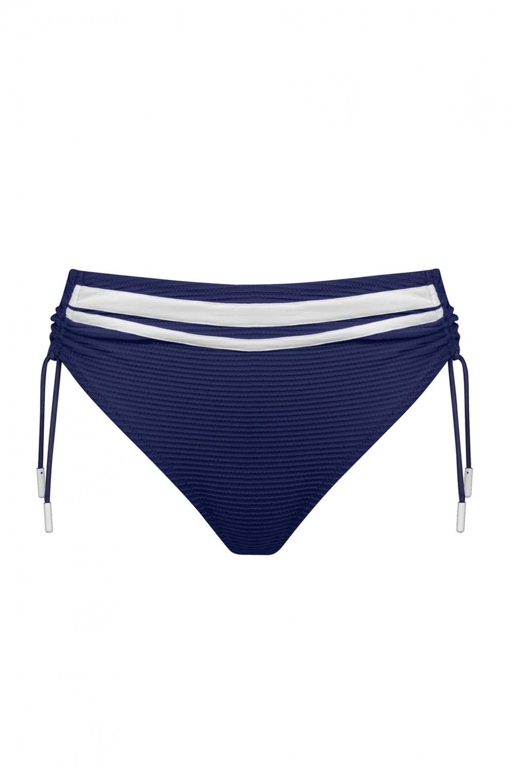 Bade-Slip mit seitlichen TunnelzĂŒgen fĂŒr eine variable Höheneinstellung. Mit schmalen SchnĂŒren und einem Knoten lĂ€sst sich dies schnell bewerkstelligen. Am Höschen sind vorn zwei Stoffstreifen in WeiĂ aufgenĂ€ht, die Bandenden stecken in ebenfalls weiĂen HĂŒlsen. Somit erfĂŒllt das Design Merkmale eines sportiven, maritimen und zeitlosen Stils. Das moderne Bademodenmaterial punktet mit feinen, in Querrichtung verlaufenden Strukturstreifen im dunklen Blau. Alle RĂ€nder sind mittels Zickzackstichen dehnbar versĂ€umt und beziehen den Futterstoff mit ein.
