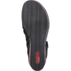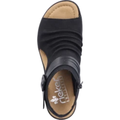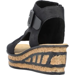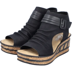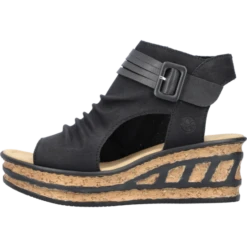 HineinschlĂŒpfen und wohlfĂŒhlen mit Rieker! Diese nachtschwarzen Keilsandaletten aus Kunstleder von Rieker garantieren ein himmlisches TragegefĂŒhl. Ein ReiĂverschluss ermöglicht einen schnellen und bequemen Einstieg. Hochwertige, breite Riemen schenken dem FuĂ besten Halt. Die leichte und schockabsorbierende Sohle mit Keilabsatz bietet anhaltendes WohlgefĂŒhl ? auch an langen Tagen. Einfach top!