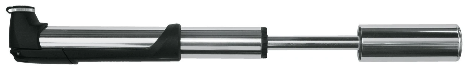 Das solide Aluminiumrohr ist teilweise mit einer eleganten Kunststoffschicht ummantelt – diese Pumpe musst du sicher nicht verstecken. Das Doppel-Ventil erlaubt den einfachen Wechsel von Schrader- und Presta-Ventil.